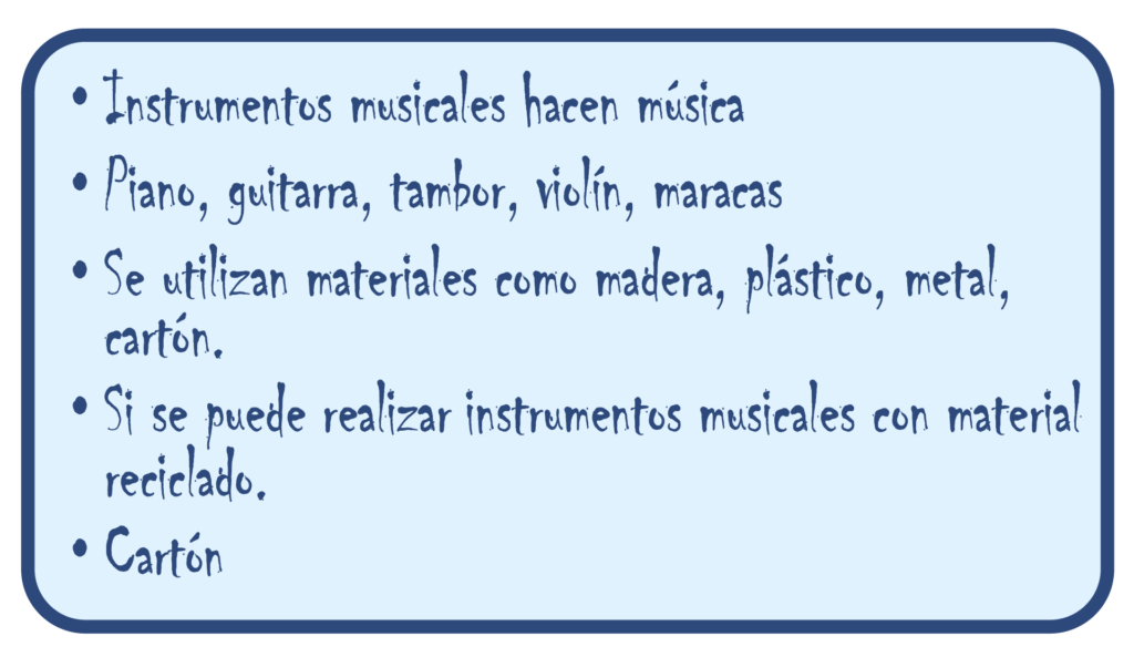 g. Recordando lo que se les pidió en la clase anterior se les solicita que enlisten todos los materiales que observaron en sus hogares y puedan servir para elaborar una guitarra, se anota en la pizarra con marcador rojo.